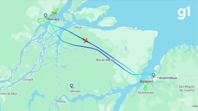 No vídeo acima, de monitoramento de voos, é possível ver o avião da Gol (em laranja), partindo da capital do Pará, dando diversas voltas sobre Macapá e retornando para Belém.