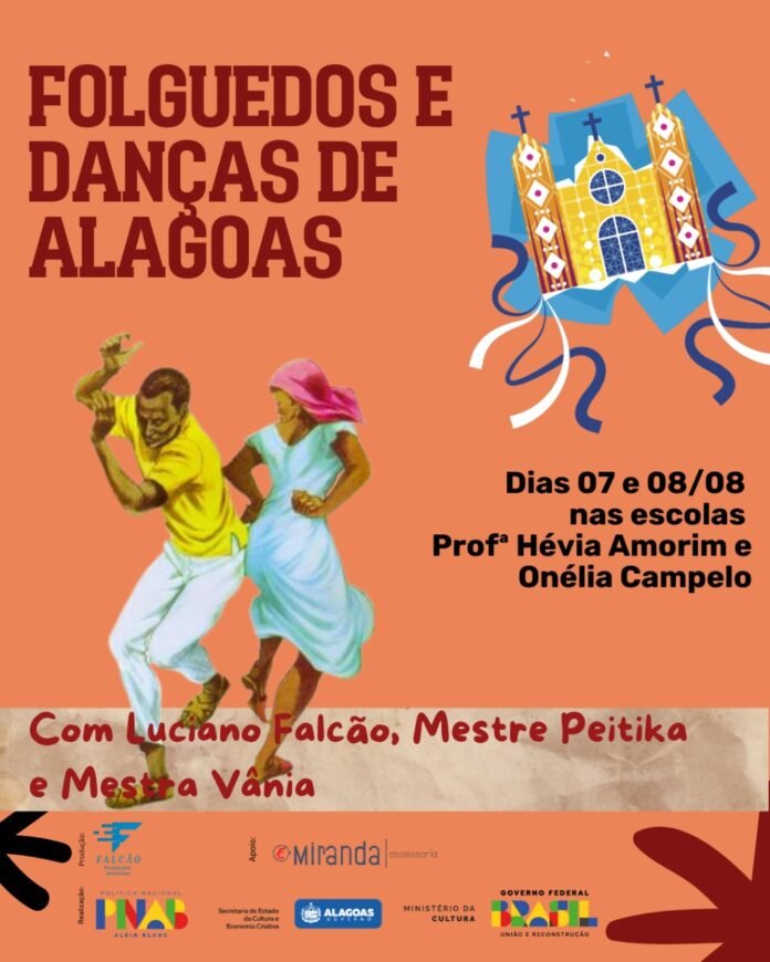 O Projeto “Folguedos e Danças de Alagoas Dentro da Escola” leva gratuitamente a cultura popular para estudantes de Escolas Públicas, como forma de reconhecimento de sua identidade cultural. Por meio de concertos didáticos, folguedos e danças tipicamente alagoanas são apresentadas para crianças e jovens da rede pública estadual de ensino na cidade de Maceió/AL, alcançando o nível de educação infantil (de 0 a 6 anos) e o ensino médio, contemplando inclusive estudantes com deficiência. Essas apresentações acontecerão nos próximos dias 07 de agosto, a partir das 19h na Escola Municipal Professora Hévia Valéria Maia Amorim, localizada no Village Campestre I e 08 de agosto, a partir das 9h 30min. na Escola Estadual Onélia Campelo, localizada no bairro de Santos Dumont.