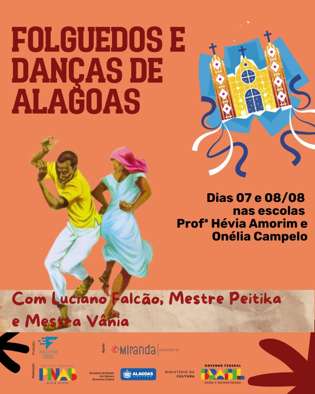 Este Projeto foi contemplado pela PNAB Alagoas (Política Nacional Aldir Blanc) e SECULT/AL. É uma iniciativa que tem autoria e coordenação do Prof. Ms. Luciano Falcão, executada em parceria com Mestre Peitika, referência no Guerreiro, e Mestra Vânia, referência no Pastoril, Coco de Roda e Marisqueira. Os Folguedos e danças escolhidos serão apresentados e cantados por eles, acompanhados pela harmonia da sanfona e pelas batidas dos instrumentos de percussão.