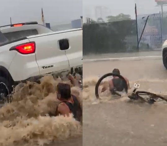 A cena é filmada pela passageira de um veículo que trafegava na avenida e apresenta a parte de trás da picape além de uma agitação embaixo dela. Após o motorista virar para a direita, o homem, aparentemente um ciclista, de blusa e bermuda de cor preta, aparece tentando se erguer, mas acaba sendo levando pela força da água por alguns metros.