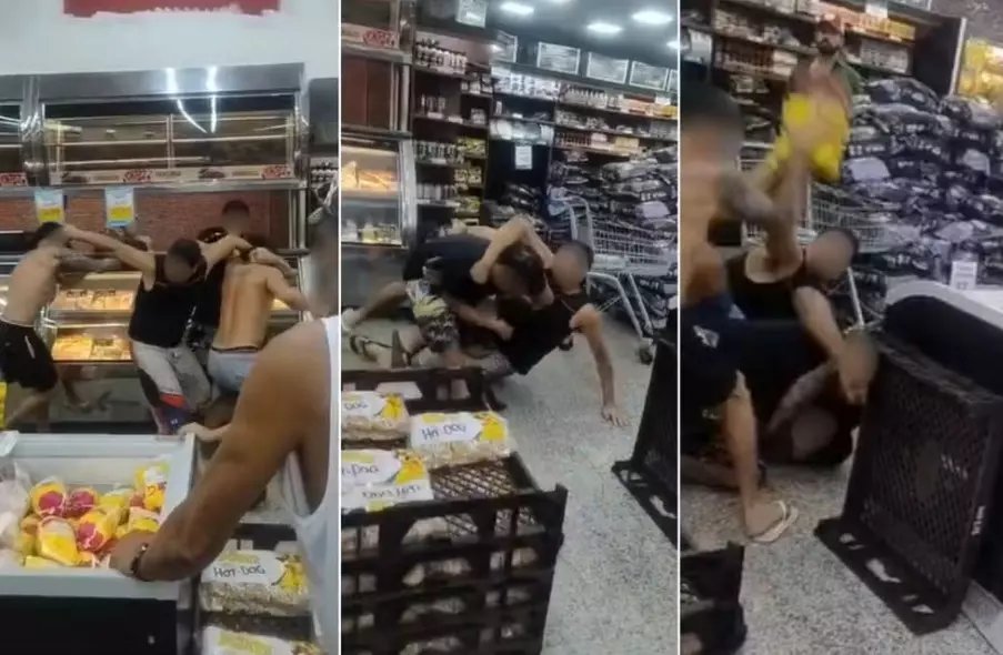 Funcionários e clientes do supermercado tentaram separar a briga, mas as agressões não cessaram e os homens começaram a arremessar produtos. Nas imagens, é possível ver o momento em que um deles jogou um pedaço de queijo em direção a dois atendentes do estabelecimento.