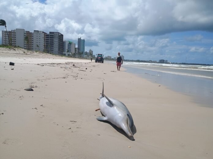 Um golfinho, da espécie Sotalia Guianensis, foi encontrado morto nesta terça-feira, 19, em um trecho da Praia da Avenida, no Centro de Maceió.