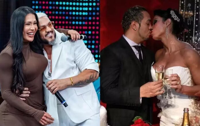 Gracyanne Barbosa quando reencontrou Belo no palco do ‘Domigão’ e no casamento deles em 2012 — Foto: divulgação/ tv globo e arquivp/ divulgação