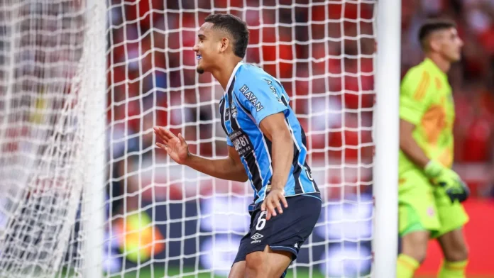 Na sequência, a cobrança de escanteio foi até a cabeça de Victor Gabriel, que colocou rente à trave do goleiro do Grêmio — para a linha de fundo.