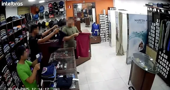 As imagens de segurança, que foram compartilhadas entre lojistas, mostram o momento em que os suspeitos circulam pela loja, recolhem as roupas dos cabides e entram com elas nos provadores.