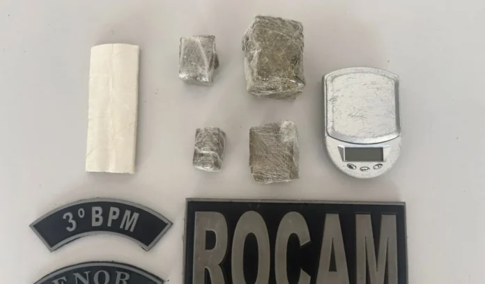 Na busca pessoal, os policiais encontraram duas porções de maconha dentro de uma bag. A proprietária do imóvel autorizou a entrada da guarnição e foram localizadas outras duas porções da droga, uma balança de precisão e um rolo de plástico filme.