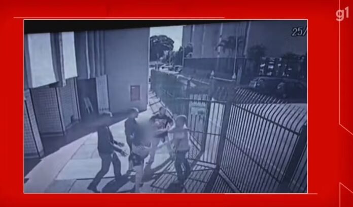 Segundo testemunhas, ele invadiu o prédio chutando a portaria e tentando forçar a entrada. Imagens de câmeras de segurança mostram o homem, de camisa bege, sendo contido por moradores do prédio .