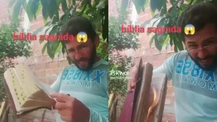 “Isso aqui é uma bíblia, que dizem que é sagrada. Olha o que ela faz diante do fogo. Ela queima”, disse o homem, no vídeo, antes de atear fogo no livro.