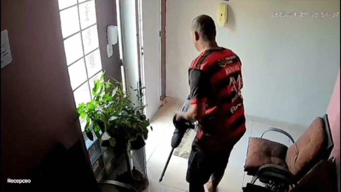 No vídeo, encaminhado a nossa equipe de reportagem, é possível ver o momento que um homem com uma camisa do Flamengo e uma bermuda de cor preta entra na recepção da clínica. Ele se dirige até o local onde esta o martelo demolidor, logo após retorna até a porta e assim pega o equipamento.