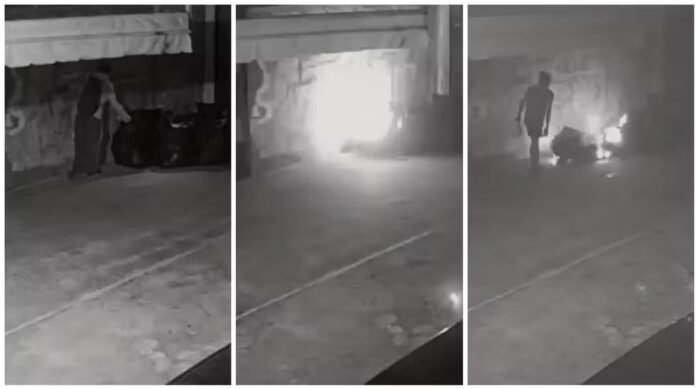 Imagens obtidas pela TV Globo mostram um homem, ainda não identificado, se aproximando de sacos que estavam na calçada e colocando fogo no material — aparentemente com um isqueiro.