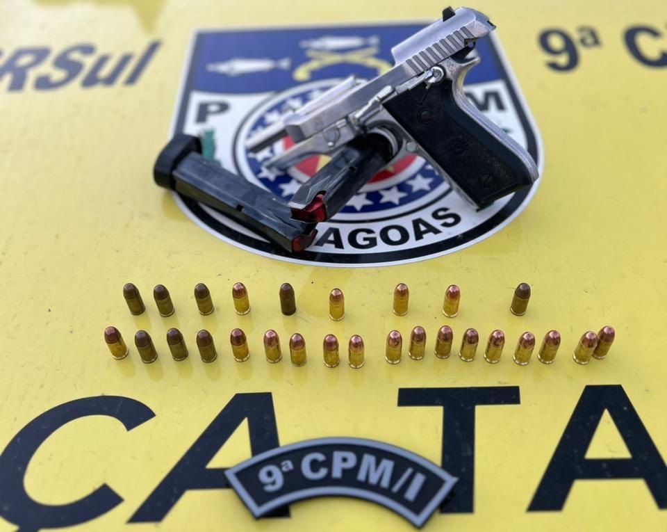 Questionado sobre possuir uma arma de fogo, o homem negou, mas posteriormente admitiu que mantinha uma pistola em sua residência, alegando que a adquiriu por estar sendo ameaçado. Com apoio da Força Tática 1, os policiais se dirigiram ao imóvel indicado, localizado em uma área conhecida por práticas ilícitas. No local, foi apreendida uma pistola de calibre 380, com dois carregadores e as 26 munições.