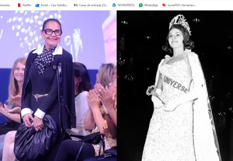 Ieda Maria Vargas durante um concurso de beleza em novembro de 2010 no Rio Grande do Sul, e quando venceu o Miss Universo, em 1963 — Foto: Ricardo Duarte/Agência RBS e Divulgação/Miss Universe
