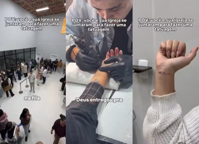 As tatuagens foram feitas no formato lettering, estilo que destaca letras e palavras, geralmente com fontes artísticas ou caligrafadas. No vídeo, os fiéis aparecem gravando na pele “Mateus 24:14”, que fala sobre pregar o evangelho no mundo todo.