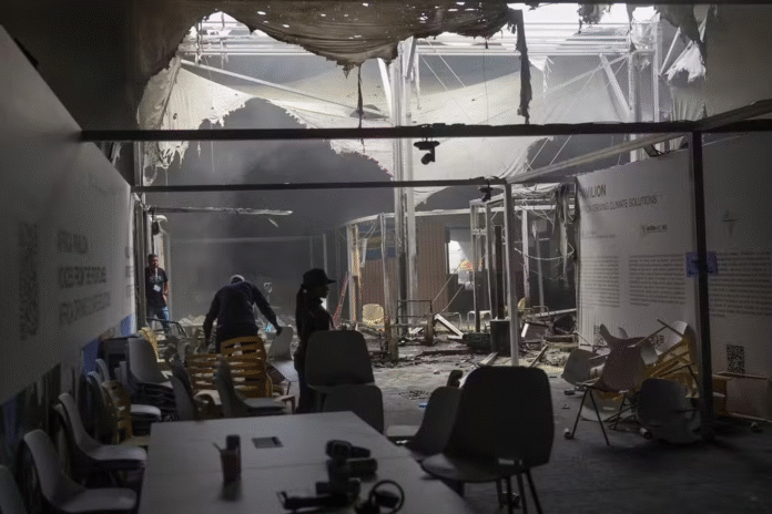 Detalhe de área que pegou fogo na COP de Belém, em 20 de novembro de 2025. | Foto: Adriano Machado/ Reuters