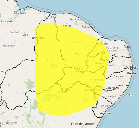O aviso de cor amarela (Perigo Potencial) é válido para 15 municípios. São eles: Água Branca, Delmiro Gouveia, Mata Grande e Pariconha.