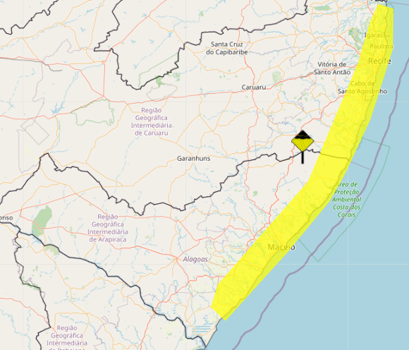 O alerta se estende até a manhã deste sábado (12) e abrange os municípios de: Barra de Santo Antônio, Barra de São Miguel, Campo Alegre, Coqueiro Seco, Coruripe, Flexeiras, Jacuípe, Japaratinga, Jequiá da Praia, Maceió, Maragogi, Marechal Deodoro, Matriz de Camaragibe, Paripueira, Passo de Camaragibe, Pilar, Porto Calvo, Porto de Pedras, Rio Largo, Roteiro, Santa Luzia do Norte, São Luís do Quitunde, São Miguel dos Campos, São Miguel dos Milagres e Satuba.