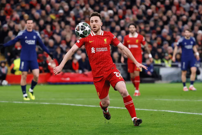 O atacante português Diogo Jota em jogo contra o PSG pela Liga dos Campeões da Europa em 11 de março de 2025 — Foto: Jason Cairnduf/Reuters