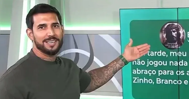 Enquanto lia a mensagem, ele comentou no meio do texto. “‘Boa tarde, meu parceiro!’. Boa tarde, Edinho. ‘O meu Palmeiras’, o nosso Palmeiras, então, ‘não jogou nada domingo [31]’, eu já concordei contigo”. Ao chegar na parte em que deveria mandar abraço aos amigos vascaínos, o apresentador parou antes de falar os nomes. “Você achou que eu cair nessa? Cê achou que eu ia cair nessa mesmo?”, declarou>[.