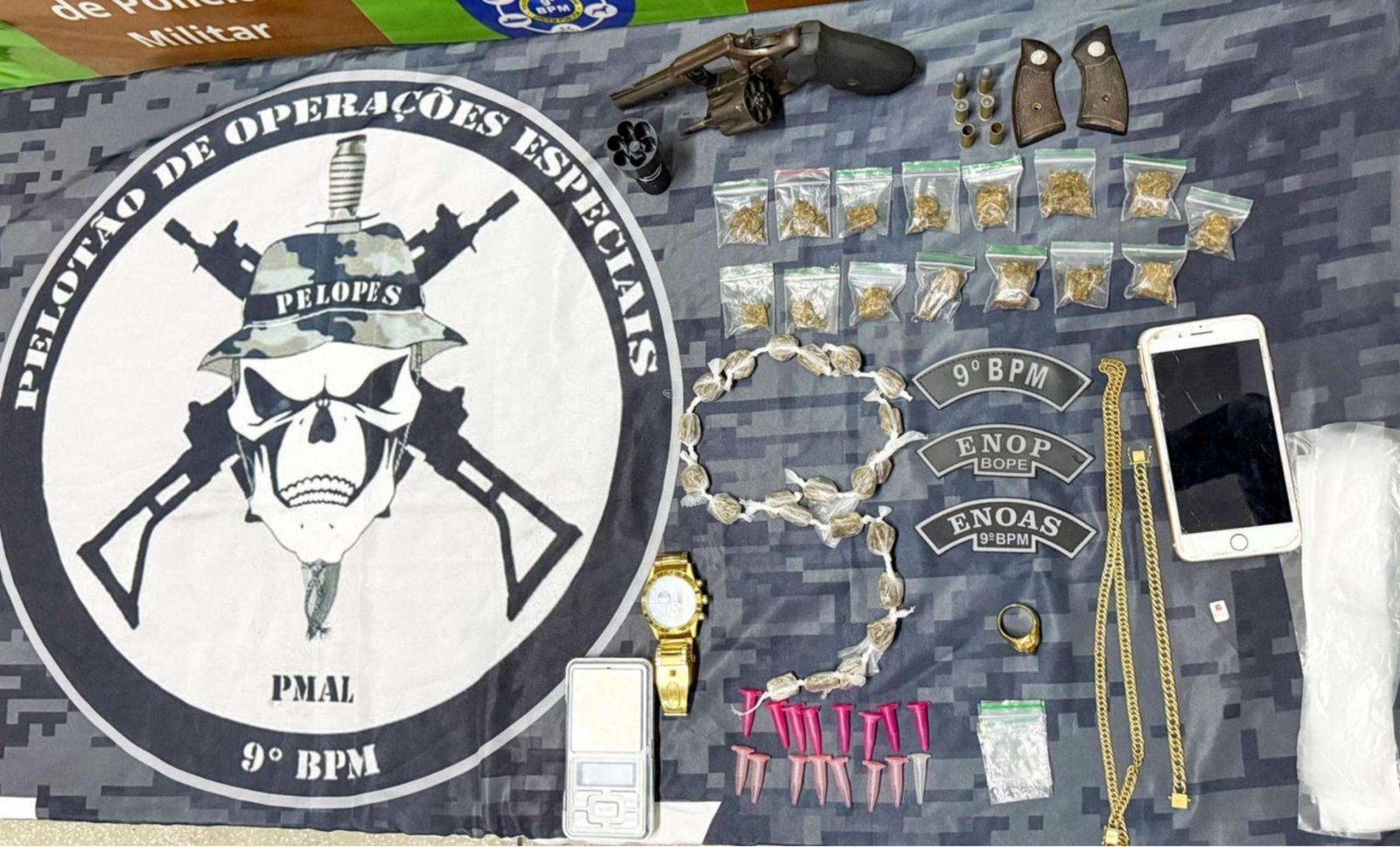 Ao ser questionado, o suspeito afirmou que havia mais entorpecentes na casa de sua avó, onde ele estaria residindo. A guarnição seguiu até o imóvel e, com a autorização da proprietária, realizou buscas e encontrou mais drogas e materiais relacionados ao tráfico. No local, foram recolhidos 60 gramas de maconha, 16 pinos para acondicionar cocaína, embalagens plásticas e uma balança de precisão.