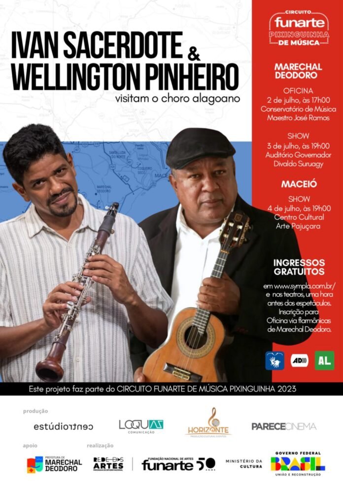 Jovens músicos das filarmônicas de Marechal Deodoro terão um papel de protagonismo em uma iniciativa inédita liderada por Ivan Sacerdote, um dos principais clarinetistas do Brasil, e pelo cavaquinista e bandolinista alagoano Wellington Pinheiro. A dupla realiza, de 2 a 4 de julho, uma oficina e dois shows com participação ativa desses jovens, selecionados entre as tradicionais sociedades musicais da cidade. As atividades promoverão um diálogo do choro produzido no estado com clássicos nacionais.