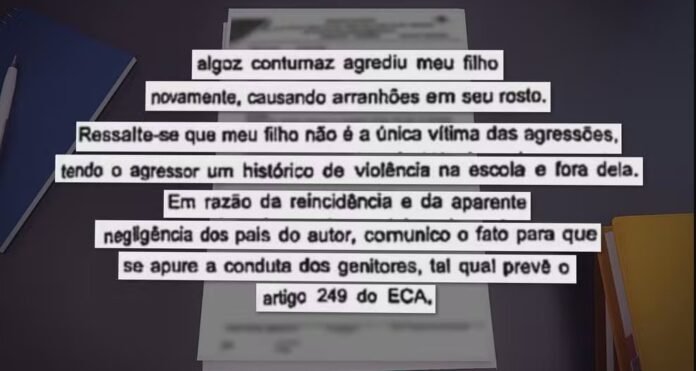 No registro, o homem descreveu a criança – que teria dado tapas em seu filho, da mesma idade – como “algoz contumaz”. Ou seja: como alguém persistentemente cruel.