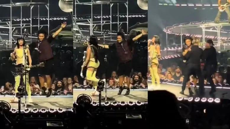 Enquanto cantava o hit ‘Hot N Cold‘, a artista foi surpreendida por um fã que subiu no palco e colocou o braço em volta dela. As imagens viralizaram nas redes sociais. Assista:
