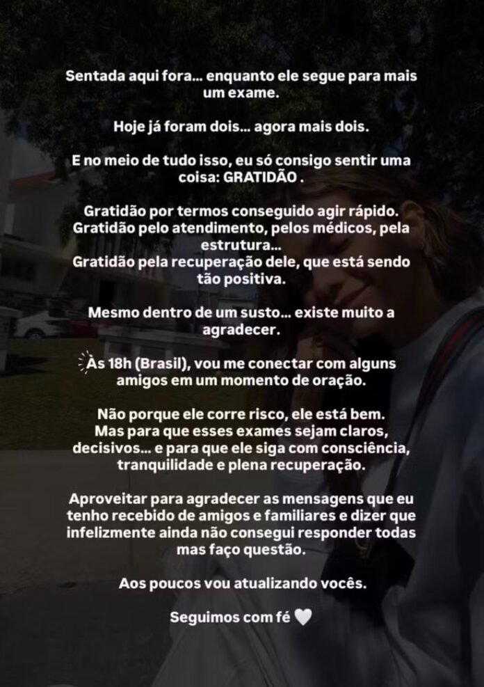 Sentada aqui fora enquanto ele segue para mais um exame. Hoje já foram dois, agora mais dois. E no meio de tudo isso, eu só consigo sentir uma coisa: gratidão“, escreveu. Ela também ressaltou a rapidez no atendimento e a evolução positiva do quadro. “Gratidão pela recuperação dele, que está sendo tão positiva“, completou.