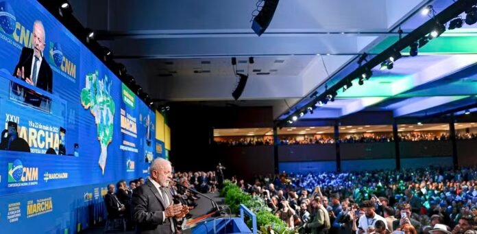 O presidente Lula discursa durante evento com prefeitos em Brasília — Foto: Ricardo Stuckert/Presidência da República