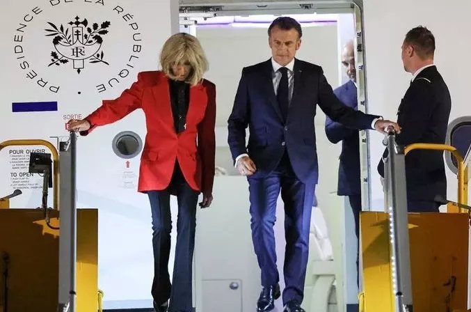 Macron parece surpreso, vira-se rapidamente e acena para a imprensa com um gesto da mão. O casal desce as escadas do avião e Emmanuel Macron estende o braço para sua esposa, como é de costume, mas ela não o aceita e apoia-se no corrimão.