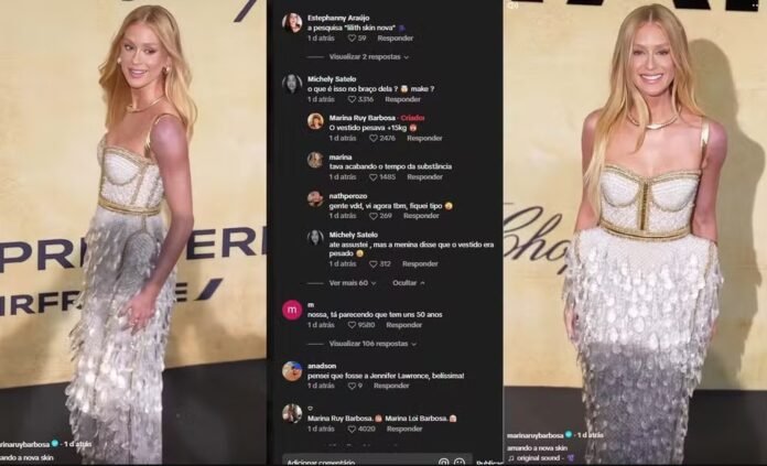 Diante dos comentários questionando a origem da lesão, Marina respondeu a uma internauta e explicou que a roupa que usou naquele dia pesava cerca de 15 quilos, indicando que ela seria o motivo de o ombro ter ficado daquela forma.