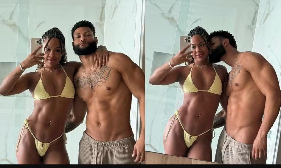 O casal posou para um selfie vestindo apenas trajes de banho e exibindo a silhueta trincada: “TBT de amor e saudade”, se declarou ela.