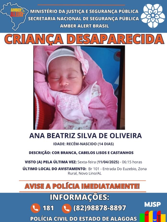 O Ministério da Justiça e Segurança Pública inseriu no “Amber Alert” — um sistema internacional de emergência que ajuda a localizar pessoas desaparecidas — o nome da bebê Ana Beatriz Silva de Oliveira, de apenas 14 dias, que foi raptada na manhã desta sexta-feira, 11, em Novo Lino, no interior de Alagoas.