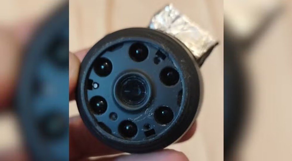 Segundo a mulher, a câmera estava instalada no suporte do ventilador de teto do quarto — Foto: Polícia Militar/Divulgação
