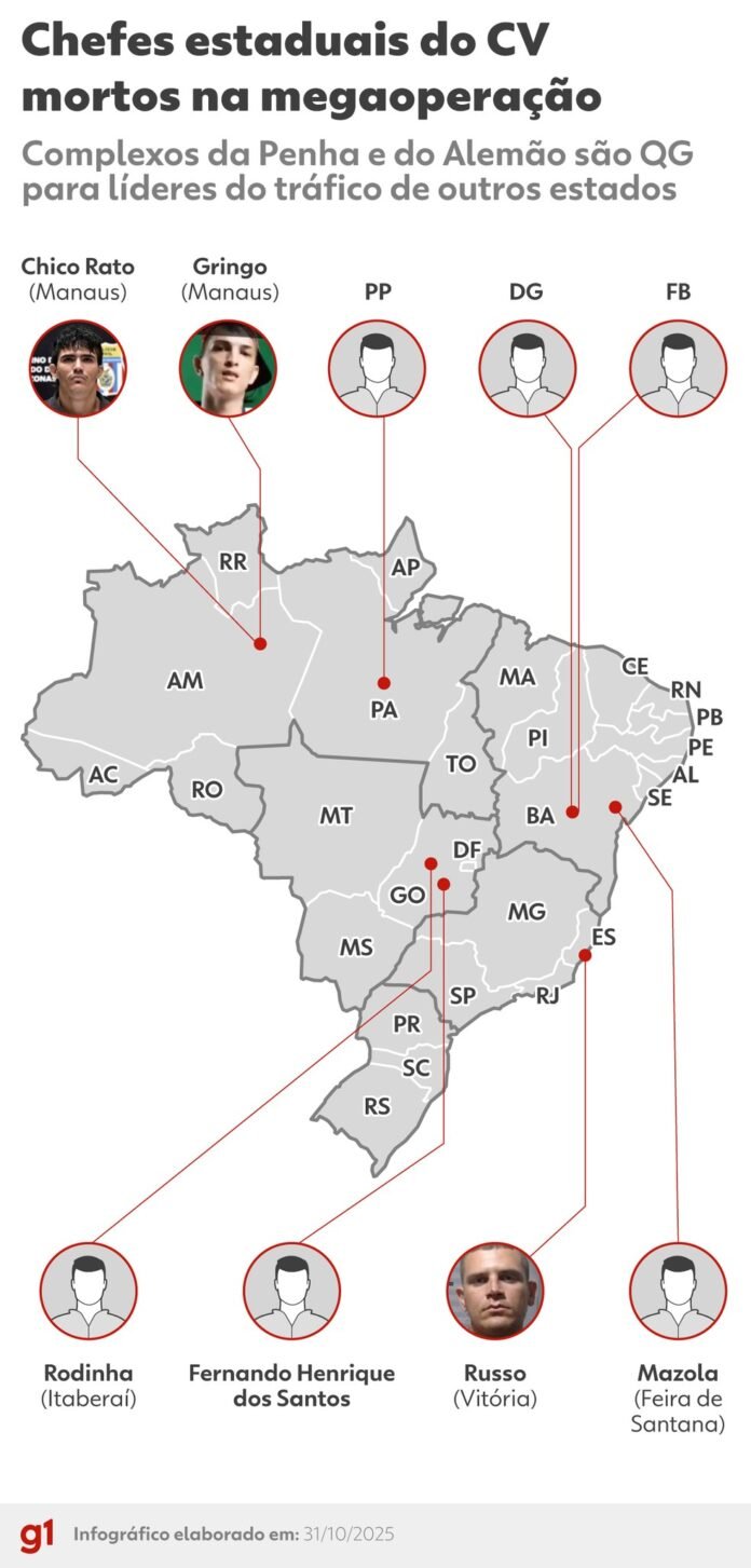 Chefes estaduais do CV mortos na megaoperação — Foto: Arte/g1Segundo Curi, os complexos da Penha e do Alemão passaram a ser o QG do Comando Vermelho em nível nacional, e o centro de decisão para todos os outros estados em que a facção criminosa tem atuação.