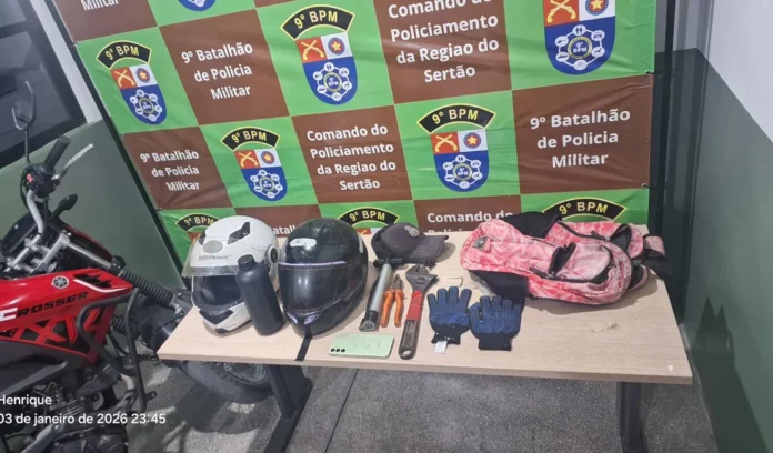 Durante a verificação nos sistemas policiais, foi constatado que a motocicleta Yamaha Crosser, placa RPH9D59, possuía queixa de roubo. Além do veículo, diversos objetos abandonados pelos suspeitos foram recuperados, entre eles dois capacetes, um aparelho celular da marca Samsung, ferramentas, uma mochila, um par de luvas e outros pertences.