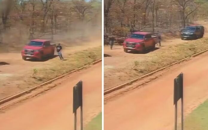 No vídeo, é possível ver quando a caminhonete vermelha para na estrada e segundos depois um homem sai do veículo e corre. Logo depois, uma viatura do batalhão de Choque chega ao local e procura por ele. O caso ocorreu na tarde de terça-feira (2).