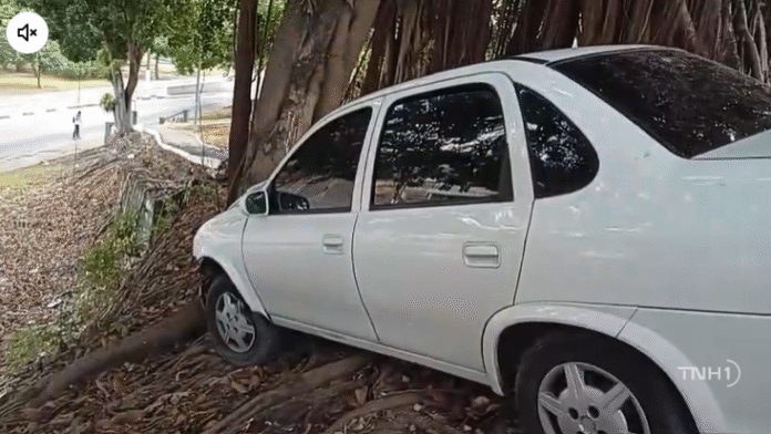 Motorista perde controle em curva, invade praça e pára após se chocar em árvore