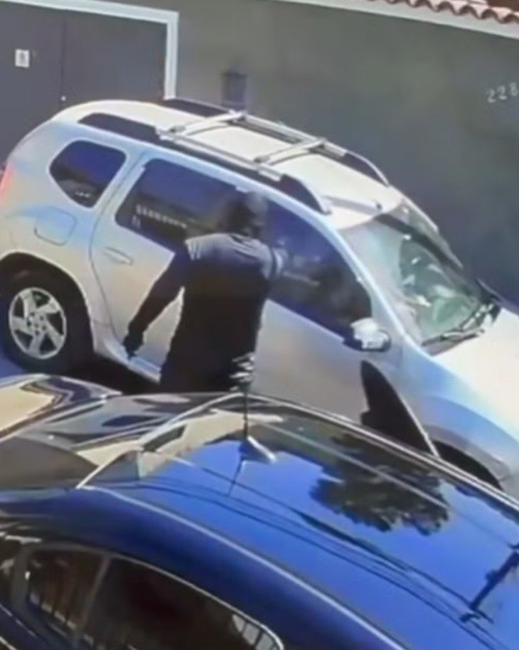 O crime foi por volta das 13h, horário em que a vítima estava saindo de casa com o marido e o filho. A vítima entra no carro enquanto o companheiro fecha o portão.