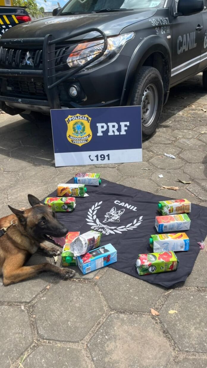Durante a verificação das malas no bagageiro, o cão farejador Kaos, do Pelotão de Canil, indicou a presença de entorpecentes em uma das bagagens. Os policiais abriram a mala e encontraram 10 tabletes de substância análoga à cocaína escondidos em embalagens de suco, totalizando 10 kg.