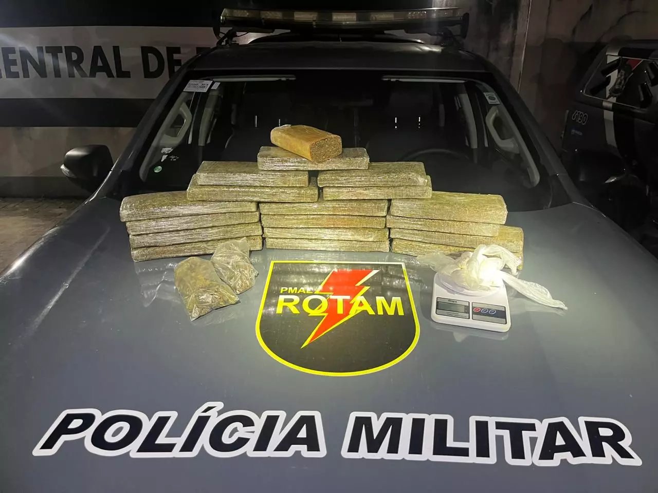 Após a busca domiciliar, foram encontrados 17 tabletes de maconha, além de porções fracionadas de cocaína, somando 14,6 quilos de entorpecentes.