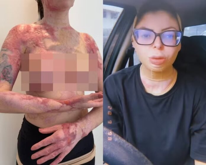 Ela sentia dor, mas só se deu conta da gravidade da situação ao ver o corpo queimado no espelho do banheiro do estabelecimento. “Eu estava toda preta, toda queimada, meu rosto queimado. O cabelo encolheu com o fogo. Minha pele derretia como cera. Eu não sei nem descrever a sensação, foi aterrorizante”.