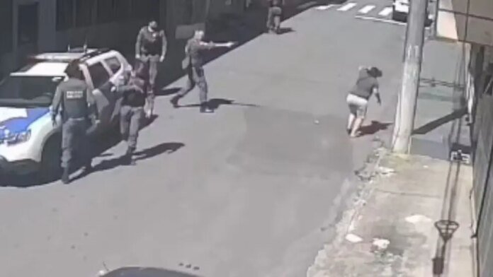 Quando ele se aproxima, há uma discussão. Uma das mulheres se levanta e vai em direção ao policial, que atira à queima-roupa, mais de uma vez. A outra corre para o outro lado da rua, mas o militar vai atrás e faz novos disparos.