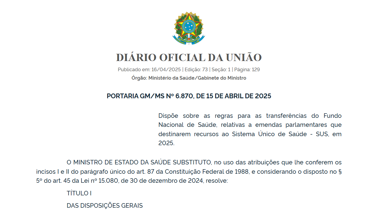 Foi publicada na última quarta-feira, 15 de abril, a Portaria GM/MS nº 6.870/2025, que traz mudanças significativas na forma de execução das transferências do Fundo Nacional de Saúde (FNS) oriundas de emendas parlamentares. A medida impacta diretamente todos os municípios alagoanos, especialmente em um momento em que os gestores municipais enfrentam grandes desafios para manter o funcionamento e a qualidade dos serviços de saúde pública.
