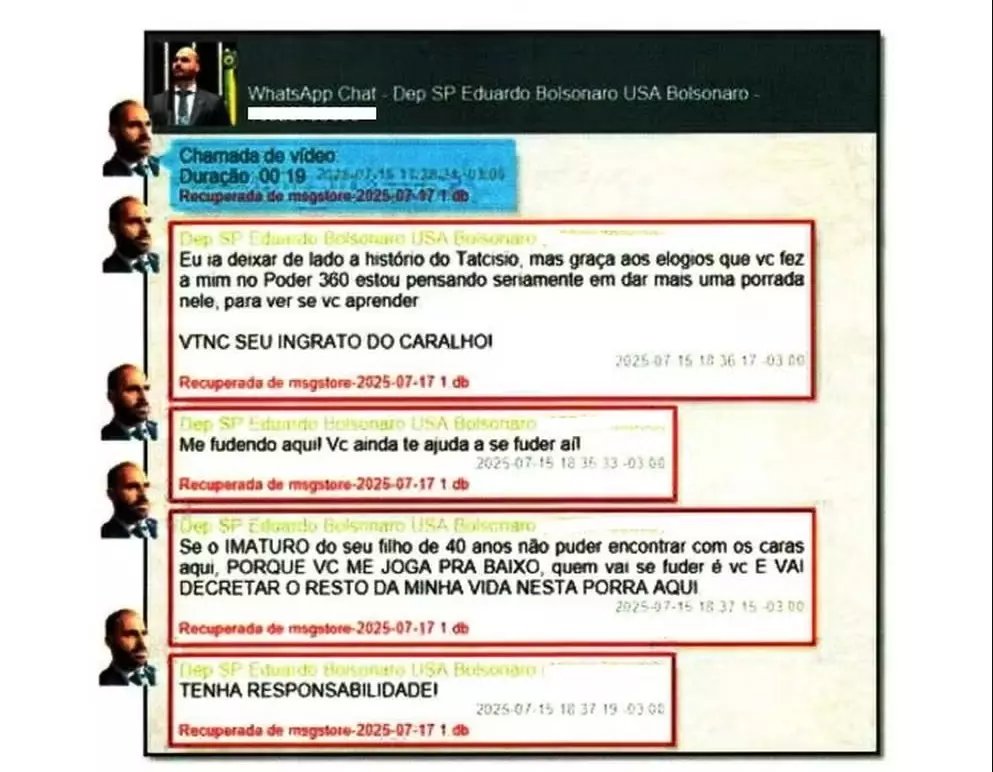 Em um dos diálogos, Eduardo escreveu ao ex-presidente: “Eu ia deixar de lado a história do Tarcísio, mas graças aos elogios que você fez a mim no Poder 360 estou pensando seriamente em dar mais uma porrada nele, para ver se você aprende”.
