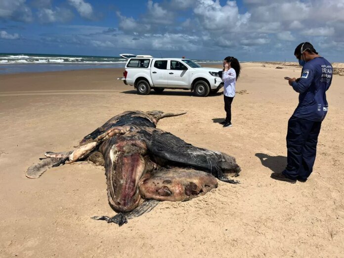 Baleia-jubarte é encontrada encalhada na praia do Pontal do Peba