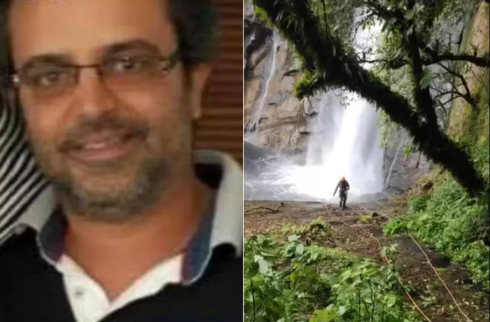 Carro de Luiz Paulo Magalhães de Freitas foi encontrado em área de mata próximo da Cachoeira Véu de Noiva (à dir.), em Bertioga (SP) — Foto: Redes sociais e Divulgação/Prefeitura de Bertioga