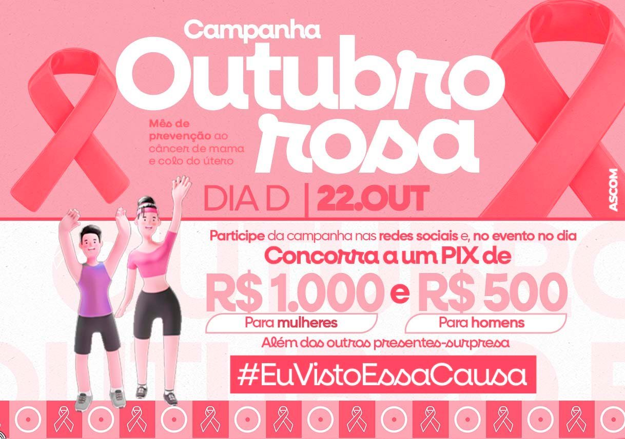 Com o tema #EuVistoEssaCausa, a iniciativa incentiva a população a vestir camisa rosa como símbolo de apoio à causa e à importância do autocuidado. O ponto alto da programação acontece no Dia D, em 22 de outubro, com uma grande caminhada, saindo da Academia da Saúde em direção à Praça, a partir das 15h.