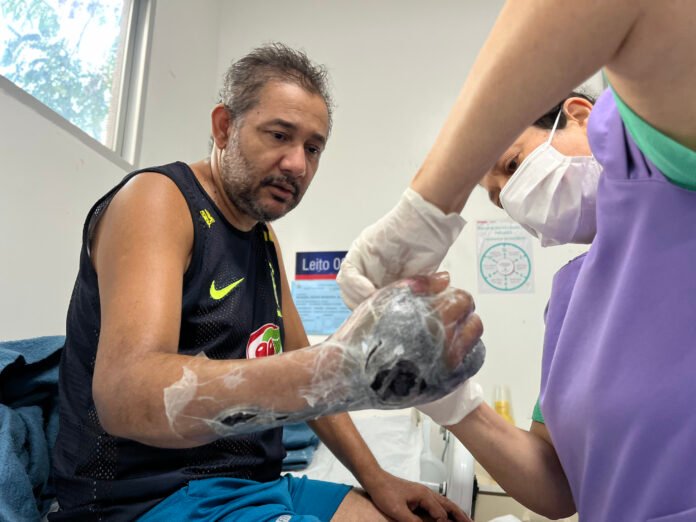 “Meu braço começou a endurecer, a pele escureceu e surgiram bolhas que se rompiam, levando pedaços da minha pele. Os exames revelaram que eu tinha diabetes e pressão alta, o que agravou tudo. As feridas não cicatrizavam, e a infecção ameaçava se espalhar pelo corpo”, relembra o pedreiro.