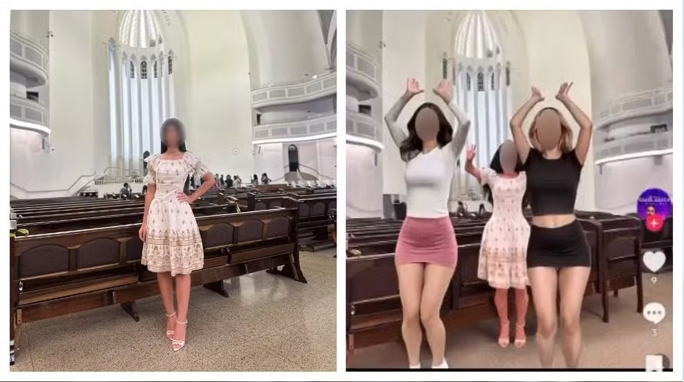 No caso dela, o influencer usou uma foto em que ela aparece de blusa de mangas compridas e saia longa, apoiada no banco da igreja, e criou um novo vídeo. Ele inseriu imagens de uma outra jovem com minissaia, e Silvio Santos, vestido com o tradicional terno com microfone.