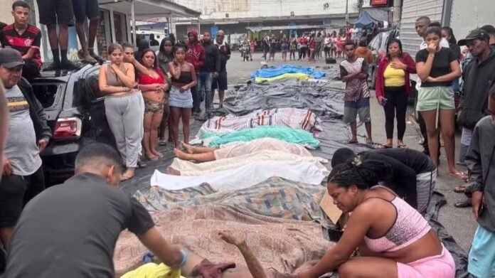 Moradores do Complexo da Penha, na Zona Norte do Rio de Janeiro, levaram pelo menos 40 corpos para a Praça São Lucas, na Estrada José Rucas, uma das principais da região, ao longo da madrugada desta quarta-feira (29), o dia seguinte à operação mais letal da história do RJ.